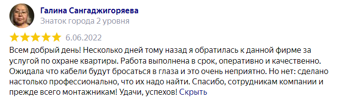 Отзыв оставленный о нашей компании в независимых источниках. Олеся Анатольевна подключила у нас охранную сигнализацию своей квартиры под охрану в г. Волгограде 21.04.2022г